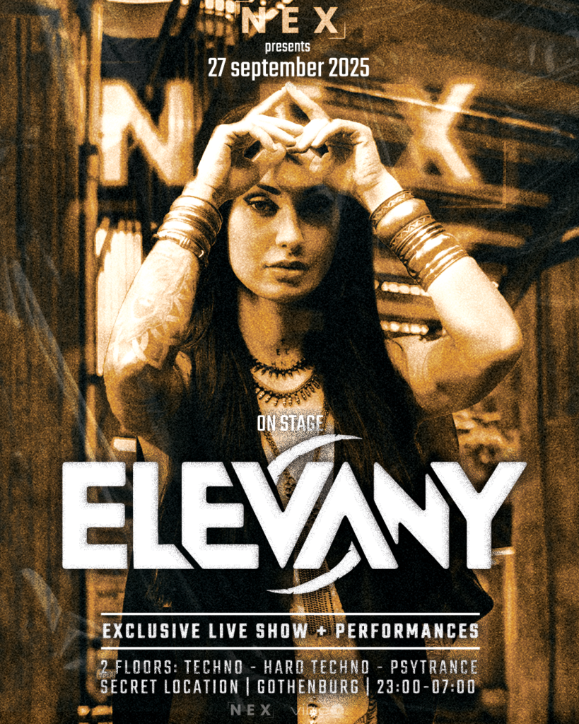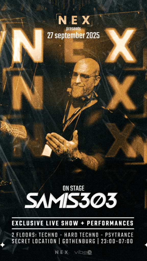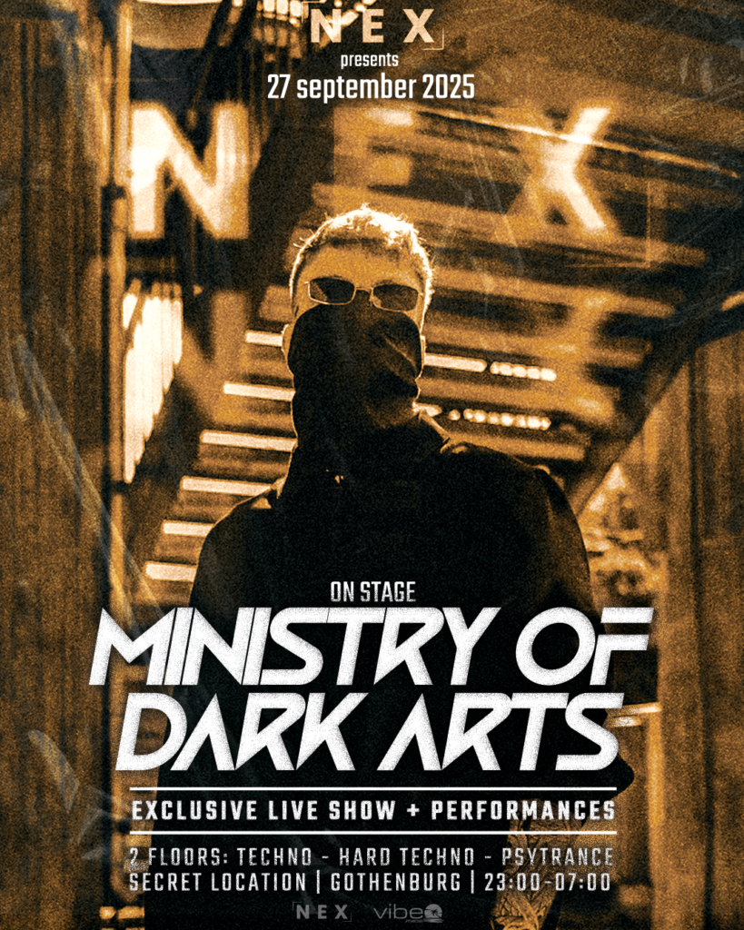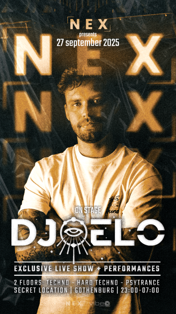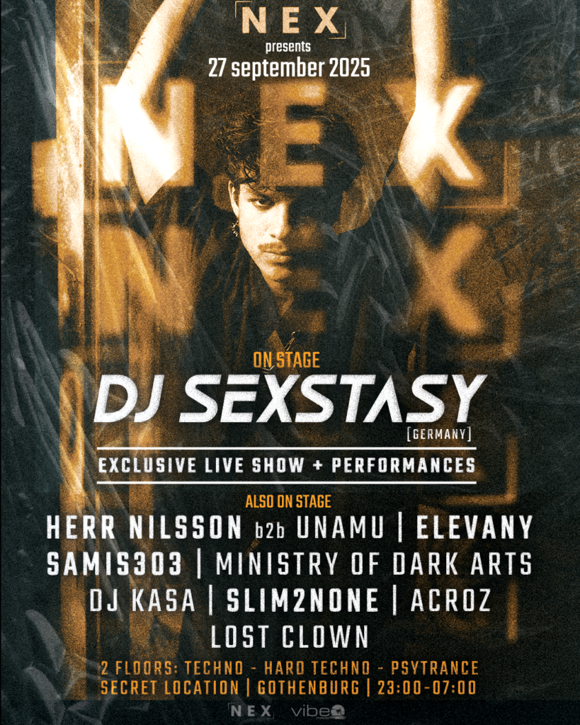 NEX fortsätter att driva Göteborgs technoscen framåt. Den 27 september 2025 går DJ SEXSTASY upp på scenen för ett exklusivt liveframträdande – ett performativt och pulserande möte mellan hard techno och psytrance. Inför detta event skapade Vibe Media en affisch som fångar exakt det: underground, råhet och exklusivitet i ett visuellt format.